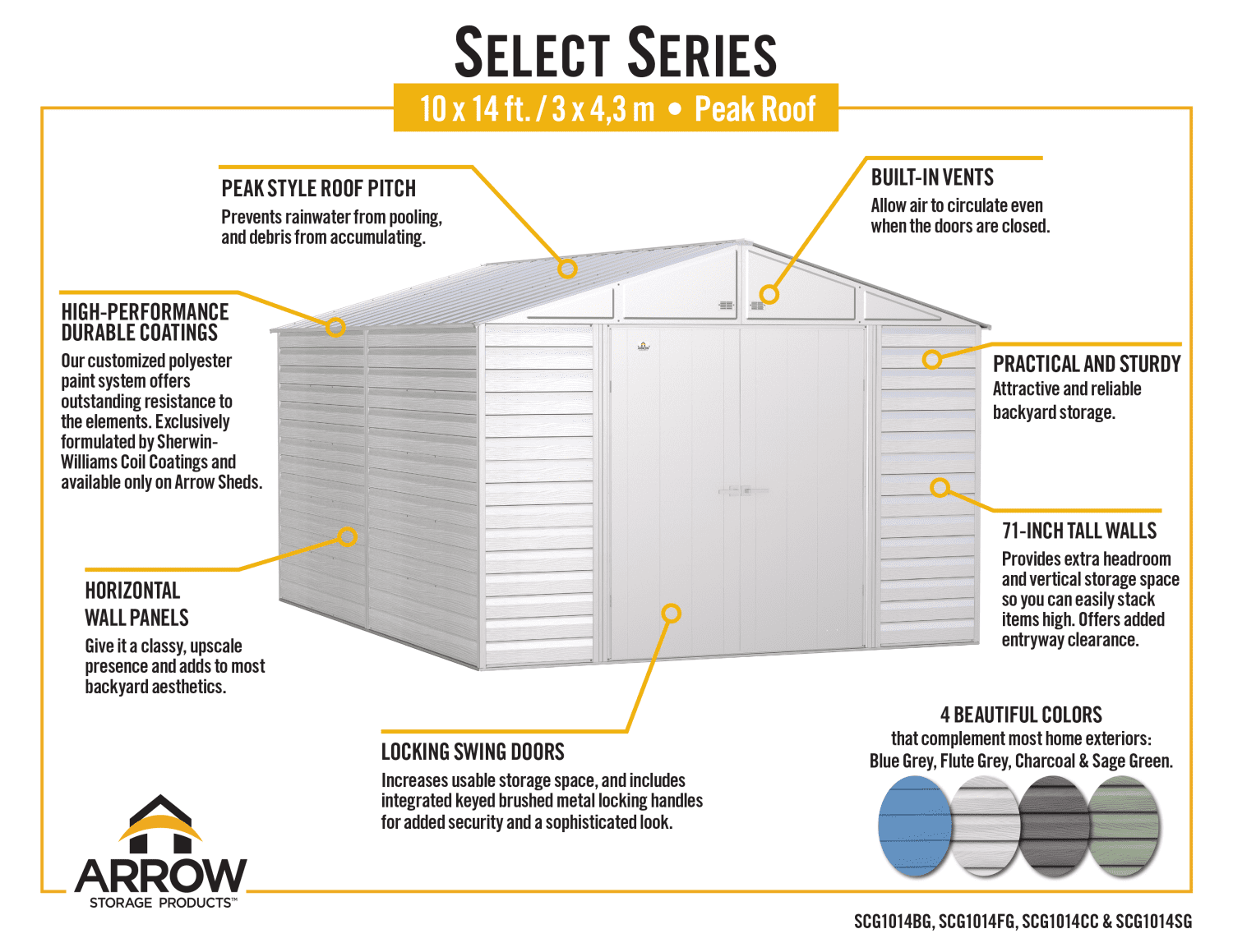 The Arrow Select line of strong�� sturdy steel storage sheds is a pleasant addition to your backyard. Made with galvanized steel that is treated to provide long-term protection against corrosion and rust�� Arrow Select sheds are engineered to protect your stored items from the elements. Inside�� the 71 in. walls provide extra headroom�� vertical storage space�� and added entryway clearance. That makes it great for storing ladders�� rakes�� pole saws�� and anything you want to pile high. The Arrow Select line also has a high gable roof to prevent pooling of rainwater and debris�� built-in air vents for better circulation�� and locking door handles for security. It also has a smooth�� strong Sherwin-Williams Paint Finish that protects it from the elements and gives the steel extra protection from rust and corrosion.Made of sturdy steel that undergoes a galvanization process to protect it from long-term corrosion and rust.. Features a smooth�� durable Sherwin-Williams polyester paint finish to protect against the elements add additional protection from rust and corrosion.. Horizontal siding panels give it a classy�� upscale presence and adds to most backyard aesthetics.. High-gabled roof pitch prevents rainwater from pooling�� and debris from accumulating.. 71 in. tall walls provide extra headroom and vertical storage space so you can easily stack items high. Offers added entryway clearance.. Swing doors increase usable storage space�� and includes integrated keyed brushed metal locking handles for added security and a sophisticated look.. Built-in vents allow air to circulate even when the doors of the unit are closed.. Includes a 12 Year Limited Warranty.. Manufactured in the USA�� with globally sourced material.