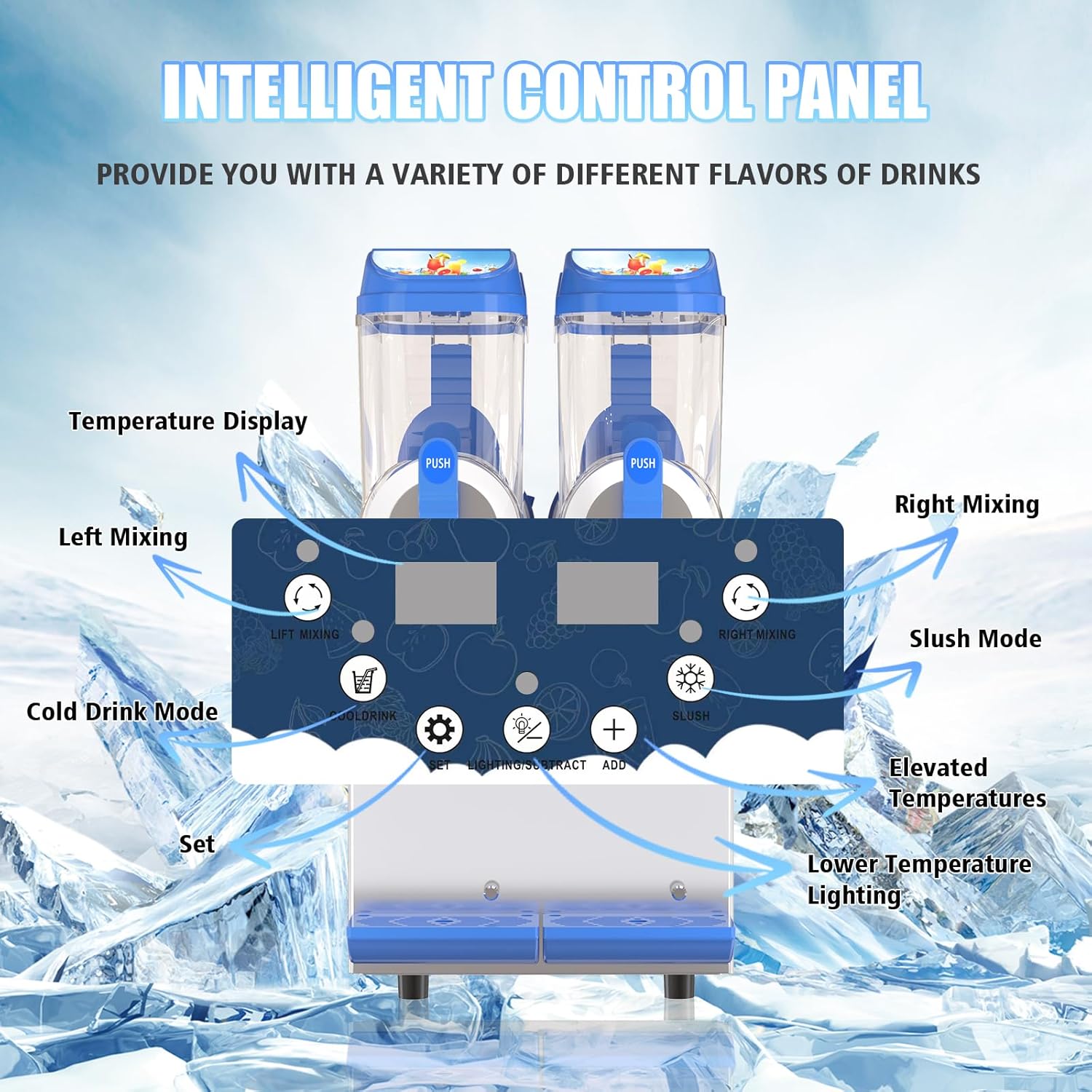 - Easy to operate: This commercial slushie machine is equipped with a control panel that makes it easier to modify the operation of the machine through a clear digital temperature display and tank lighting.