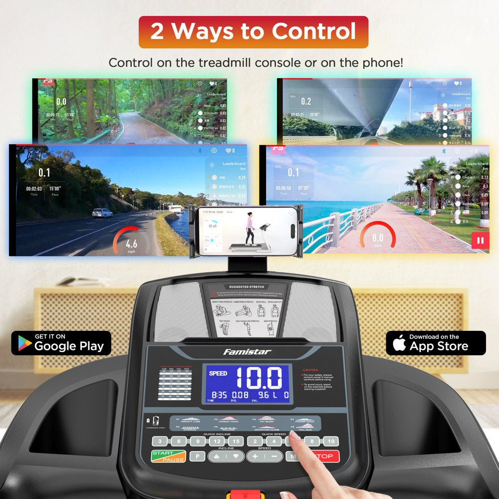 Console: Quick buttons for speed/incline/programs. Features a 5″ blue backlit LCD display. heart rate sensors. and Bluetooth speakers.