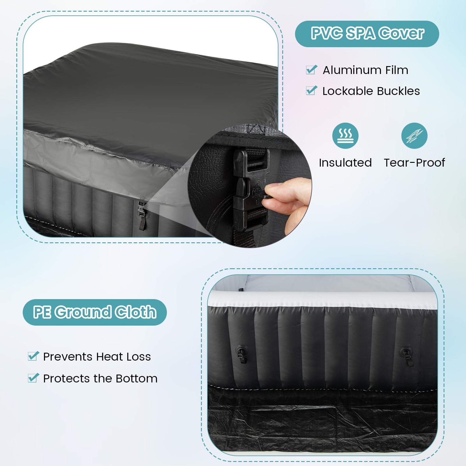 - High-Strength Materials: The hot tub boasts a 3-layered PVC wall structure. robustly designed to withstand punctures. tears. scratches. and fading. Besides. it features an aluminum-filmed PVC SPA cover that accelerates the heating process and a durable PE ground cloth to protect the pool's bottom.